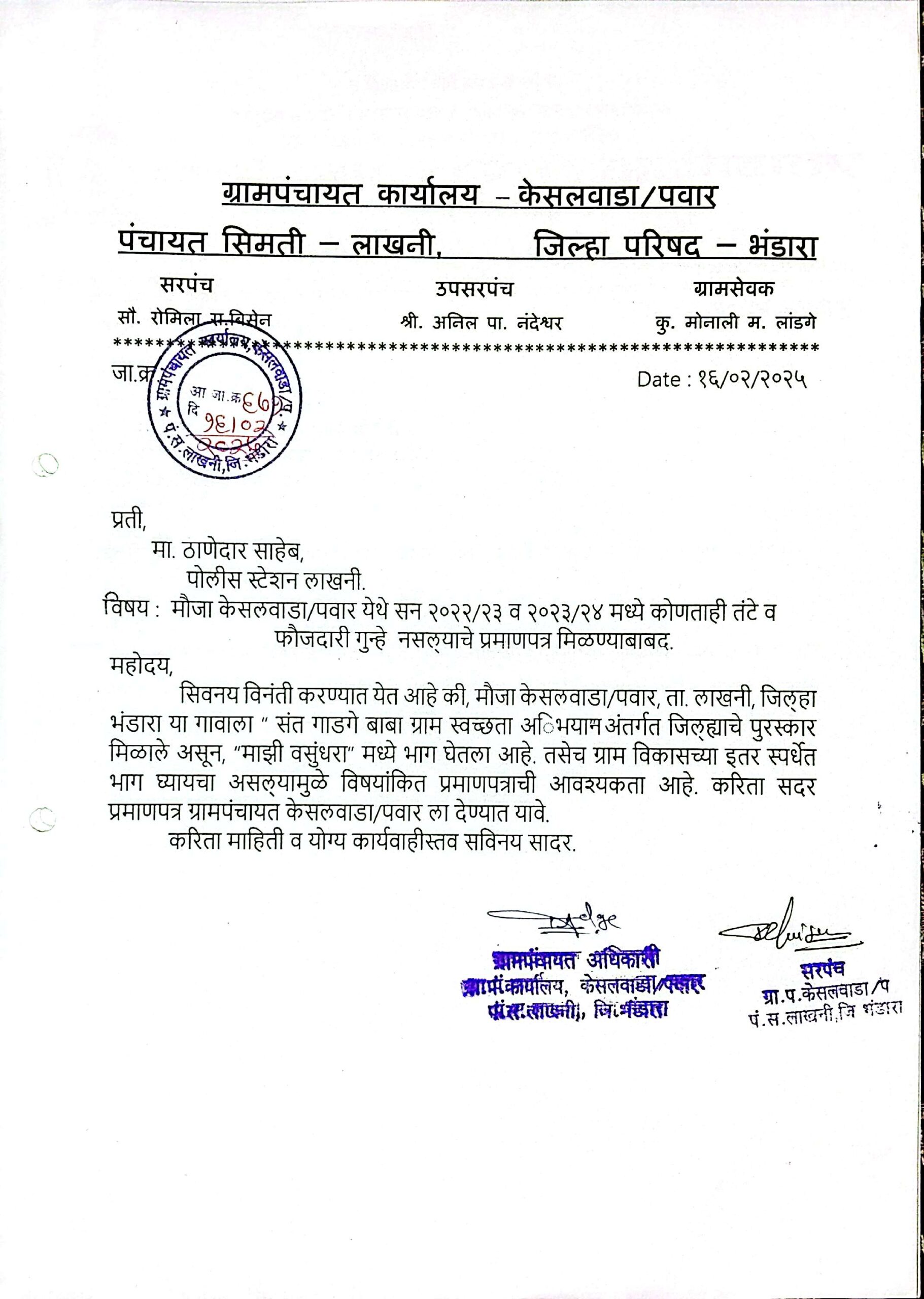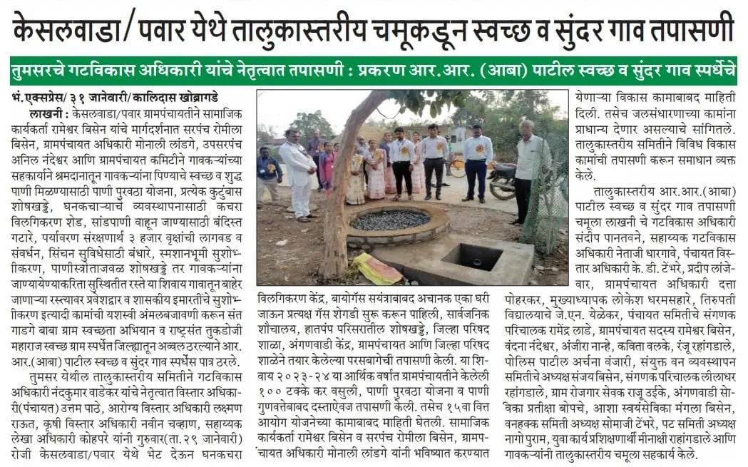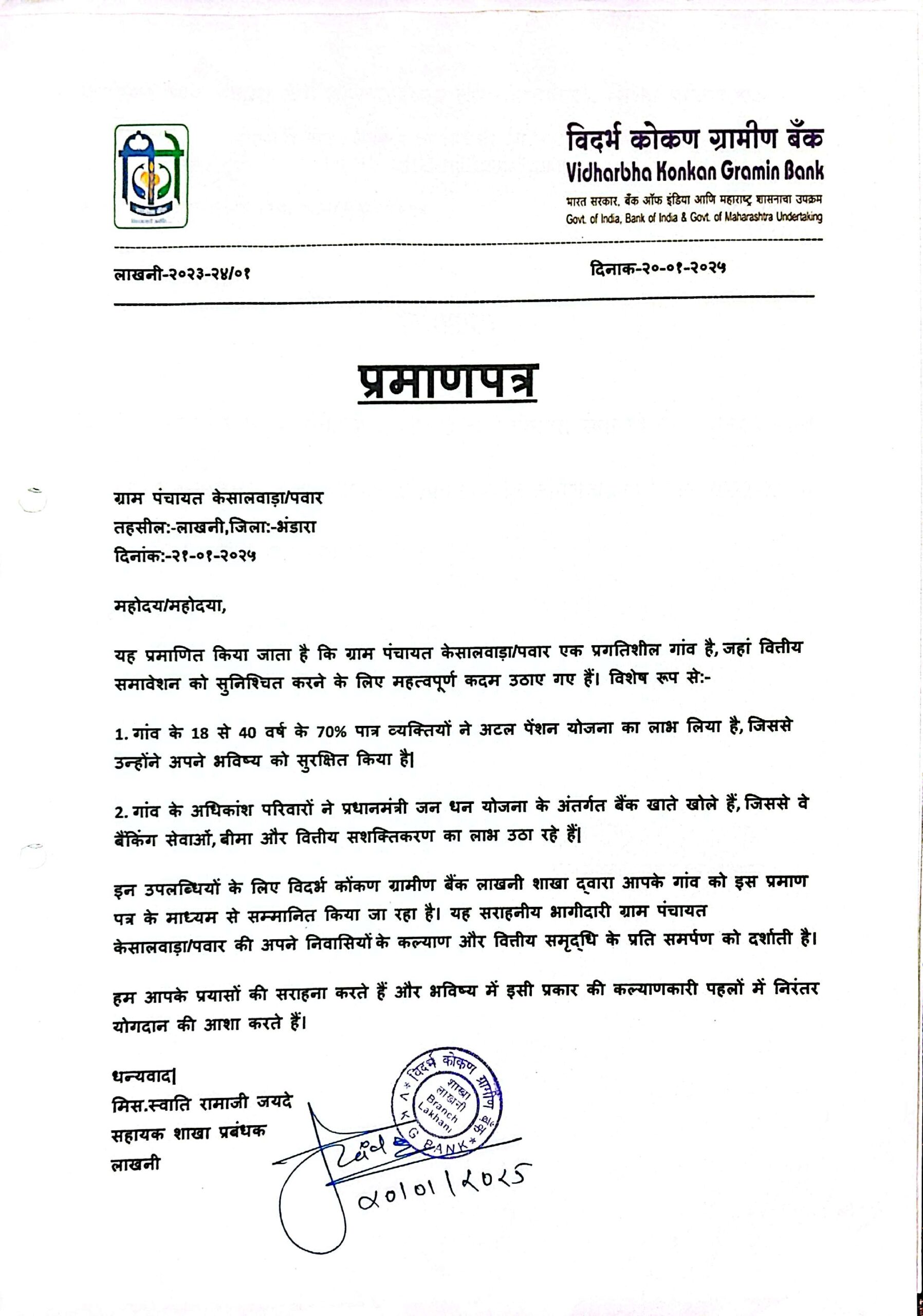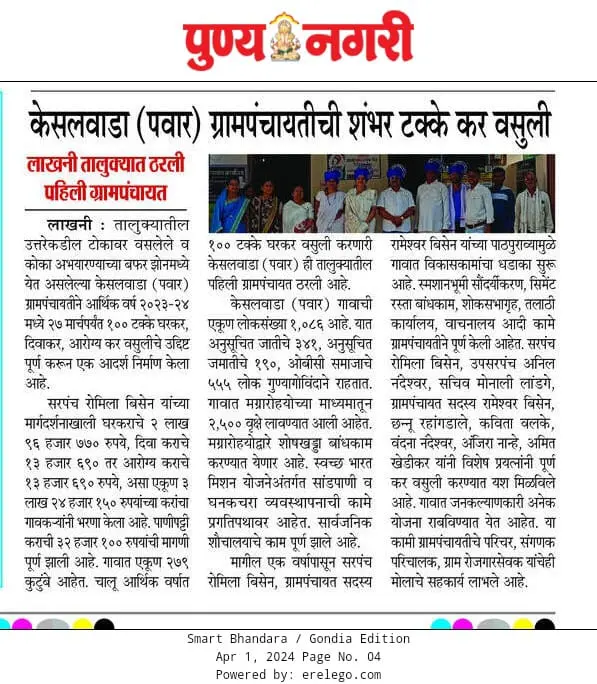 वित्तीय वर्ष २०२४-२०२५ मध्ये केसलवाडा/पवार गावाने १००% कर वसुलीचा उद्दिष्ट यशस्वीरित्या पूर्ण करून एक आदर्श निर्माण केला आहे. ग्रामपंचायतच्या नियोजनबद्ध कार्यपद्धती, ग्रामस्थांचे सहकार्य आणि करभरणासंदर्भातील जनजागृतीमुळे ही उल्लेखनीय कामगिरी शक्य झाली. घरपट्टी, पाणीपट्टी, व्यवसाय कर इत्यादी सर्व स्थानिक कर वेळेवर व नियमितपणे जमा करण्यात आले. यामुळे गावाच्या आर्थिक सक्षमीकरणाला बळ मिळाले असून विकासकामांसाठी आवश्यक निधीची उपलब्धता सुनिश्चित झाली आहे. १००% कर वसुलीमुळे गावाची शासन दरबारी प्रतिमा उंचावली असून, पारदर्शक व जबाबदार प्रशासनाच्या दिशेने एक महत्त्वपूर्ण पाऊल ठरले आहे.