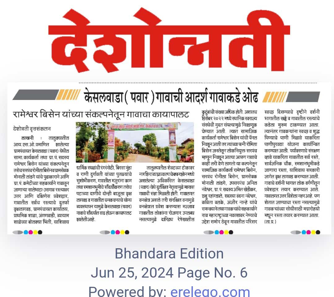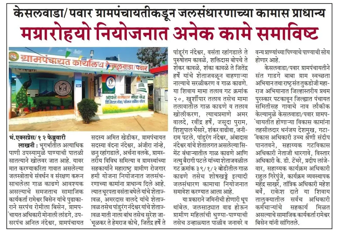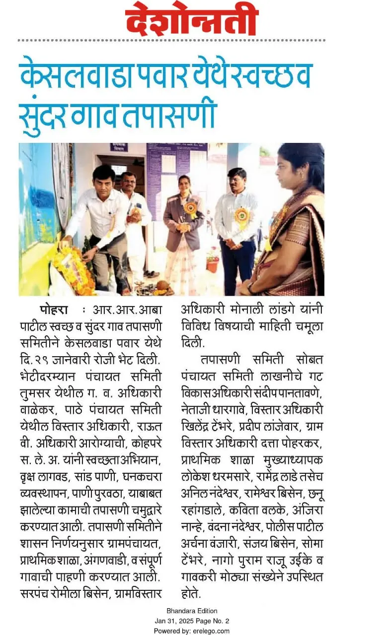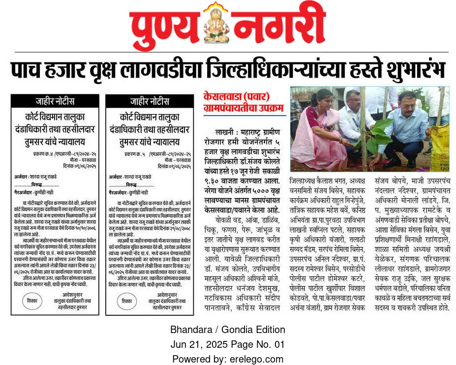 ग्रामपंचायत केसलवाडा पवार यांनी पर्यावरण संवर्धनासाठी 5000 वृक्ष लागवडीचा महत्वाकांक्षी उपक्रम हाती घेतला आहे. या उपक्रमाचा शुभारंभ महाराष्ट्र ग्रामीण रोजगार हमी योजनेंतर्गत मा. जिल्हाधिकारी डॉ. संजय कोलते यांच्या शुभहस्ते 17 जून रोजी सकाळी 9.30 वाजता करण्यात आला. नरेगा योजनेच्या माध्यमातून 5000 वृक्ष लागवड करण्याचा मानस ग्रामपंचायतीने व्यक्त केला असून हा हरित संकल्प गावाच्या शाश्वत विकासासाठी मोलाचा ठरणार आहे.